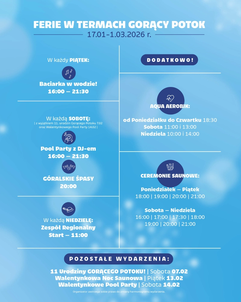 Zastanawiasz się, jak aktywnie i przyjemnie spędzić ferie zimowe? Termy Gorący Potok zapraszają na niezapomniany czas pełen relaksu, zabawy i góralskiego klimatu! Od 17 stycznia do 1 marca 2026 roku przygotowaliśmy dla Was specjalny grafik wydarzeń, w którym każdy znajdzie coś dla siebie.