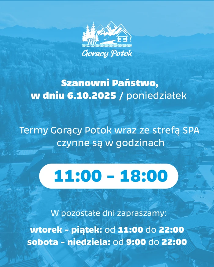 informujemy, że w dniu 6 października 2025 godziny otwarcia kompleksu Term Gorący Potok ulegną zmianie – obiekt będzie czynny do godziny 18:00.
