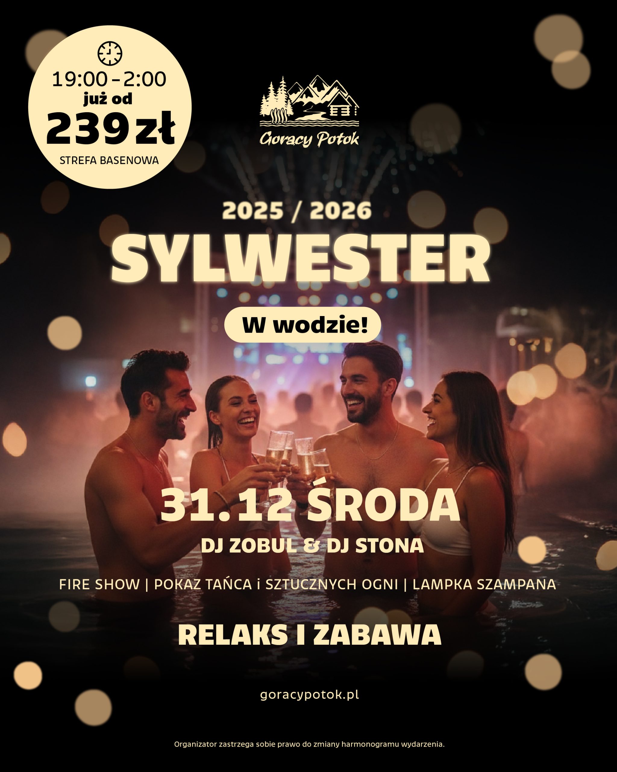 Letos pořádáme nejžhavější bazénovou párty roku s DJ Zobul a DJ Stona, kteří vědí, jak rozproudit taneční parket. Hosté se mohou těšit i na další atrakce pro zpestření večera: uvítací sklenku šampaňského, ohnivou show – velkolepou ohnivou show v bazénu, profesionální taneční a ohňostrojnou show a tematické saunové ceremoniály v lázeňské a wellness zóně „Grzysno Przyjemność“*.