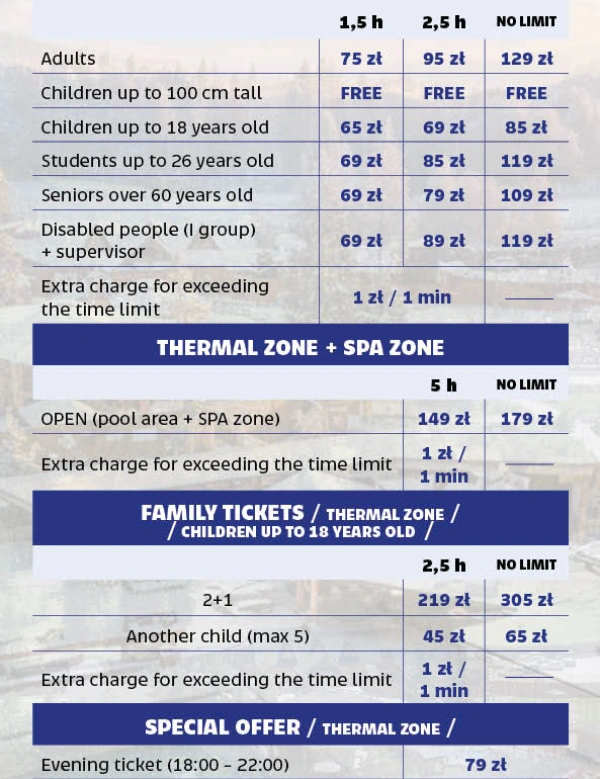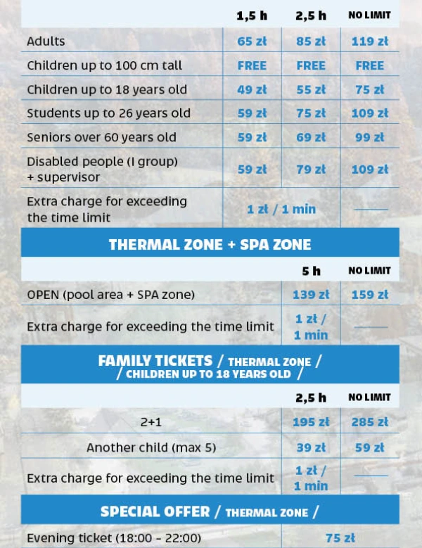 Surcharge for the swimming pool zone +1zł/1min. after exceeding 15 min.