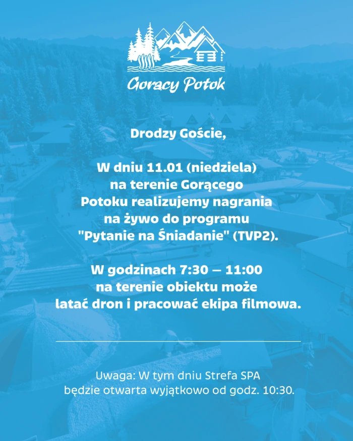 Kalendarz Kalendarz wydarzeń Sprawdź harmonogram nadchodzących wydarzeń bądź na bieżąco Codzienne ceremonie saunowe, aqua aerobik, występy zespołów muzycznych, czy pool party z DJ to tylko niektóre z organizowanych wydarzeń. Sprawdź nasz kalendarz wydarzeń i zaplanuj swoją wizytę w Termach Gorący Potok grudzieństyczeń 2026luty PNWTŚRCZWPTSOBNIE 293031123456789101112131415161718192021222324252627282930311 Wydarzenia w dniu 29 grudzień 18:00 - 21:30Ceremonie saunowe 18:00, 19:00, 20:00, 21:00 Sauna Gawra - Strefa SPA "Grzysno Przyjemność" 19:00Pool Party – The History Of Ekwador & D-Bomb Wydarzenia w dniu 30 grudzień 18:00 - 21:30Ceremonie saunowe 18:00, 19:00, 20:00, 21:00 Sauna Gawra - Strefa SPA "Grzysno Przyjemność" Wydarzenia w dniu 31 grudzień 18:00 - 21:30Ceremonie saunowe 18:00, 19:00, 20:00, 21:00 Sauna Gawra - Strefa SPA "Grzysno Przyjemność" 19:00DJ Zobul i Stona – sylwestrowe pool party Strefa basenowa 21:00 - 21:00Fire Show Strefa basenowa 23:00Pokaz tańca – sylwestrowe show Strefa basenowa 23:55Pokaz sztucznych ogni Strefa basenowa Wydarzenia w dniu 1 styczeń 13:00 - 15:00Aqua Aerobik 13:00, 15:00 Strefa basenowa 14:00 - 18:00Zespół Ahaju Strefa basenowa 18:00 - 21:30Ceremonie saunowe 18:00, 19:00, 20:00, 21:00 Sauna Gawra - Strefa SPA "Grzysno Przyjemność" Wydarzenia w dniu 2 styczeń 16:00 - 21:30Pool Party z DJ Strefa basenowa 18:00 - 21:30Ceremonie saunowe 18:00, 19:00, 20:00, 21:00 Sauna Gawra - Strefa SPA "Grzysno Przyjemność" Wydarzenia w dniu 3 styczeń 11:00 - 13:00Aqua Aerobik 11:00, 13:00 Strefa basenowa 16:00 - 21:30Pool Party z DJ Golden Strefa basenowa 16:00 - 21:30Ceremonie saunowe 16:00. 17:00, 17:30, 18:00, 19:00, 20:00, 21:00 Sauna Gawra - Strefa SPA "Grzysno Przyjemność" Wydarzenia w dniu 4 styczeń 10:00 - 14:00Aqua Aerobik 10:00, 14:00 Strefa basenowa 11:00 - 16:00Zespół regionalny „Wiarusy” Strefa basenowa 16:00 - 21:30Ceremonie saunowe 16:00. 17:00, 17:30, 18:00, 19:00, 20:00, 21:00 Sauna Gawra - Strefa SPA "Grzysno Przyjemność" Wydarzenia w dniu 5 styczeń 12:00 - 14:00Aqua Aerobik 12:00, 14:00 Strefa basenowa 18:00 - 21:30Ceremonie saunowe 18:00, 19:00, 20:00, 21:00 Sauna Gawra - Strefa SPA "Grzysno Przyjemność" Wydarzenia w dniu 6 styczeń 10:00 - 12:00Aqua Aerobik 10:00, 12:00 Strefa basenowa 11:00 - 16:00Kolędowanie z zespołem Send the Voice Strefa basenowa 18:00 - 21:30Ceremonie saunowe 18:00, 19:00, 20:00, 21:00 Sauna Gawra - Strefa SPA "Grzysno Przyjemność" Wydarzenia w dniu 7 styczeń 18:00 - 21:30Ceremonie saunowe 18:00, 19:00, 20:00, 21:00 Sauna Gawra - Strefa SPA "Grzysno Przyjemność" Wydarzenia w dniu 8 styczeń 18:00 - 21:30Ceremonie saunowe 18:00, 19:00, 20:00, 21:00 Sauna Gawra - Strefa SPA "Grzysno Przyjemność" Wydarzenia w dniu 9 styczeń 16:00 - 21:30Pool Party z DJ Strefa basenowa 18:00 - 21:30Ceremonie saunowe 18:00, 19:00, 20:00, 21:00 Sauna Gawra - Strefa SPA "Grzysno Przyjemność" Wydarzenia w dniu 10 styczeń 11:00 - 13:00Aqua Aerobik 11:00, 13:00 Strefa basenowa 16:00 - 21:30Pool Party z DJ Strefa basenowa 16:00 - 21:30Ceremonie saunowe 16:00. 17:00, 17:30, 18:00, 19:00, 20:00, 21:00 Sauna Gawra - Strefa SPA "Grzysno Przyjemność" Wydarzenia w dniu 11 styczeń 10:00 - 14:00Aqua Aerobik 10:00, 14:00 Strefa basenowa 16:00 - 21:30Ceremonie saunowe 16:00. 17:00, 17:30, 18:00, 19:00, 20:00, 21:00 Sauna Gawra - Strefa SPA "Grzysno Przyjemność" Wydarzenia w dniu 12 styczeń 18:00 - 21:30Ceremonie saunowe 18:00, 19:00, 20:00, 21:00 Sauna Gawra - Strefa SPA "Grzysno Przyjemność" 18:30 - 19:00Aqua aerobik 18:30 Strefa basenowa Wydarzenia w dniu 13 styczeń 18:00 - 21:30Ceremonie saunowe 18:00, 19:00, 20:00, 21:00 Sauna Gawra - Strefa SPA "Grzysno Przyjemność" 18:30 - 19:00Aqua aerobik 18:30 Strefa basenowa Wydarzenia w dniu 14 styczeń 18:00 - 21:30Ceremonie saunowe 18:00, 19:00, 20:00, 21:00 Sauna Gawra - Strefa SPA "Grzysno Przyjemność" 18:30 - 19:00Aqua aerobik 18:30 Strefa basenowa Wydarzenia w dniu 15 styczeń 18:00 - 21:30Ceremonie saunowe 18:00, 19:00, 20:00, 21:00 Sauna Gawra - Strefa SPA "Grzysno Przyjemność" 18:30 - 19:00Aqua aerobik 18:30 Strefa basenowa Wydarzenia w dniu 16 styczeń 16:00 - 21:30Pool Party z DJ Strefa basenowa 18:00 - 21:30Ceremonie saunowe 18:00, 19:00, 20:00, 21:00 Sauna Gawra - Strefa SPA "Grzysno Przyjemność" Wydarzenia w dniu 17 styczeń 11:00 - 13:00Aqua Aerobik 11:00, 13:00 Strefa basenowa 16:00 - 21:30Pool Party z DJ Strefa basenowa 16:00 - 21:30Ceremonie saunowe 16:00. 17:00, 17:30, 18:00, 19:00, 20:00, 21:00 Sauna Gawra - Strefa SPA "Grzysno Przyjemność" 20:00 - 21:30Śpasy ze „Zbójami” Strefa basenowa Wydarzenia w dniu 18 styczeń 10:00 - 14:00Aqua Aerobik 10:00, 14:00 Strefa basenowa 11:00 - 16:00Zespół Regionalny Squbani Strefa basenowa 16:00 - 21:30Ceremonie saunowe 16:00. 17:00, 17:30, 18:00, 19:00, 20:00, 21:00 Sauna Gawra - Strefa SPA "Grzysno Przyjemność" Wydarzenia w dniu 19 styczeń 18:00 - 21:30Ceremonie saunowe 18:00, 19:00, 20:00, 21:00 Sauna Gawra - Strefa SPA "Grzysno Przyjemność" 18:30 - 19:00Aqua aerobik 18:30 Strefa basenowa Wydarzenia w dniu 20 styczeń 18:00 - 21:30Ceremonie saunowe 18:00, 19:00, 20:00, 21:00 Sauna Gawra - Strefa SPA "Grzysno Przyjemność" 18:30 - 19:00Aqua aerobik 18:30 Strefa basenowa Wydarzenia w dniu 21 styczeń 18:00 - 21:30Ceremonie saunowe 18:00, 19:00, 20:00, 21:00 Sauna Gawra - Strefa SPA "Grzysno Przyjemność" 18:30 - 19:00Aqua aerobik 18:30 Strefa basenowa Wydarzenia w dniu 22 styczeń 18:00 - 21:30Ceremonie saunowe 18:00, 19:00, 20:00, 21:00 Sauna Gawra - Strefa SPA "Grzysno Przyjemność" 18:30 - 19:00Aqua aerobik 18:30 Strefa basenowa Wydarzenia w dniu 23 styczeń 16:00 - 21:30Pool Party z DJ Strefa basenowa 18:00 - 21:30Ceremonie saunowe 18:00, 19:00, 20:00, 21:00 Sauna Gawra - Strefa SPA "Grzysno Przyjemność" Wydarzenia w dniu 24 styczeń 11:00 - 13:00Aqua Aerobik 11:00, 13:00 Strefa basenowa 16:00 - 21:30Pool Party z DJ Strefa basenowa 16:00 - 21:30Cere
