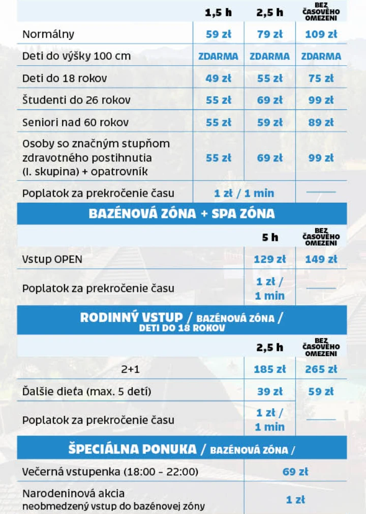 Cenník - Termály Gorący Potok